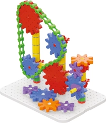 Rozmanité ozubené kolo, hřídele, spojky a podložky umožní tvořit vysoké a funkční konstrukce. Přiložené samolepky dodají stavbám osobitost.