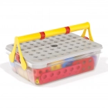 Všechny díly uložíte do pevného boxu s rukojetí. Perforované víko slouží jako stavební plocha – ideální na doma i na cesty.