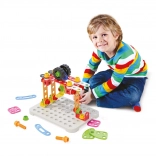 Víko kufříku slouží jako stavební základna, takže si děti mohou hrát doma i na cestách. Barevné prvky přitahují pozornost, podporují učení hrou a rozvíjejí technické myšlení i kreativitu.
