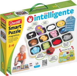 Quercetti Smart Puzzle Magnetico je ideální hračka pro nejmenší děti, která je nejen zábavná, ale i vzdělávací. Tato hravá sada, určená pro děti od 12 měsíců, obsahuje tabulku s 12 magnetickými dílky, jež lze snadno zasunout do připravených otvorů, čímž se podporuje rozpoznávání tvarů a barev.