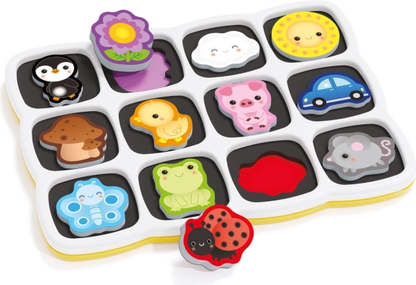 Obsahuje 12 pestrobarevných magnetických dílků, které pomáhají dětem učit se barvy a tvary zábavným způsobem.