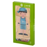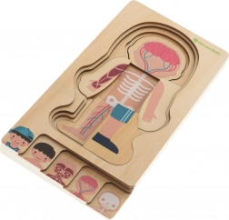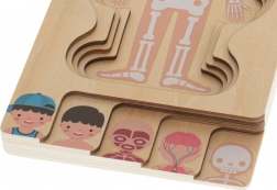 Sada obsahuje dřevěnou základnu a 28 jednotlivých dílků, které se skládají od skeletu až po oděv postavy. Díky jednoduchému designu a přírodním materiálům puzzle podporuje principy Montessori metodiky, která se zaměřuje na komplexní výuku dítěte.
