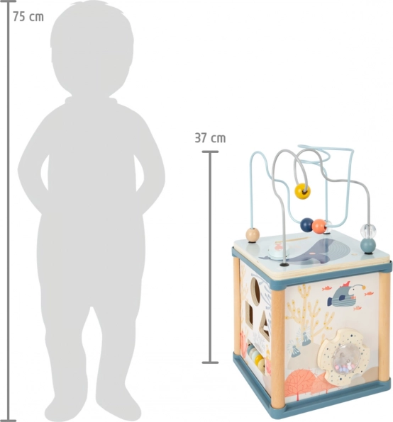 Tato dřevěná aktivní kostka s motivem podmořského světa nabízí pět stran plných aktivit a navíc zábavný magnetický rybolov – dílky z vkládačky lze chytat magnetickou udičkou přímo uvnitř kostky. Barevné ilustrace mořských tvorů podporují zrakové vnímání, pružná chobotnice zase přidává hravý prvek, který děti motivuje k dalším objevům.