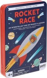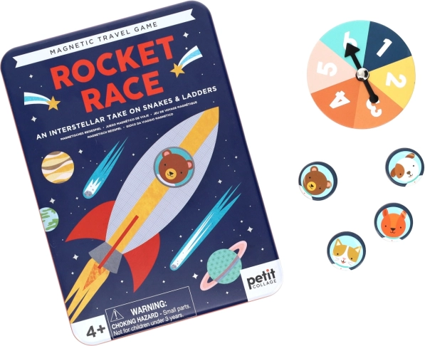Zažijte vzrušení z vesmírného závodu s touto magnetickou hrou od Petit Collage. Tuto hru v kovové krabičce s veselými ilustracemi si prostě zamilujete. Objevujte vesmírné černo s magnetickými dílky a otočným kolečkem, které posouvá vaši strategii do nové dimenze.