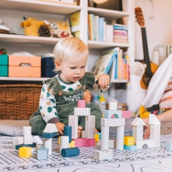 Tato nadčasová dřevěná stavebnice nabídne dětem nekonečné možnosti stavění – od jednoduchých věží až po malé architektonické skvosty. Kostky jsou navrženy tak, aby skvěle padly do malých ruček, a díky zaobleným hranám a hladkému povrchu se s nimi manipuluje snadno a bezpečně. Různorodé tvary a barvy podporují kreativitu, prostorovou představivost a první logické souvislosti.