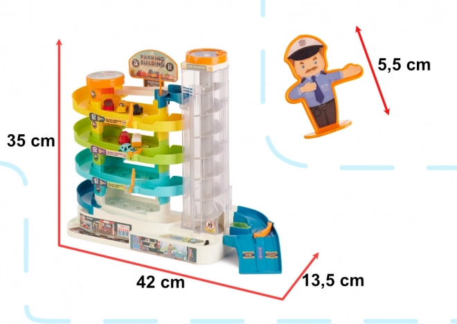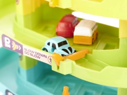Objevte multifunkční parkovací garáž, která promění dětský pokoj v rušné město. Čtyři prostorná patra nabídnou spoustu místa pro parkování, výtah vyveze autíčka až na vrchol a nechybí ani heliport pro oblíbený vrtulník. Elektrický režim výtahu doplňují veselá světla a melodie, v případě potřeby lze výtah ovládat ručně.
