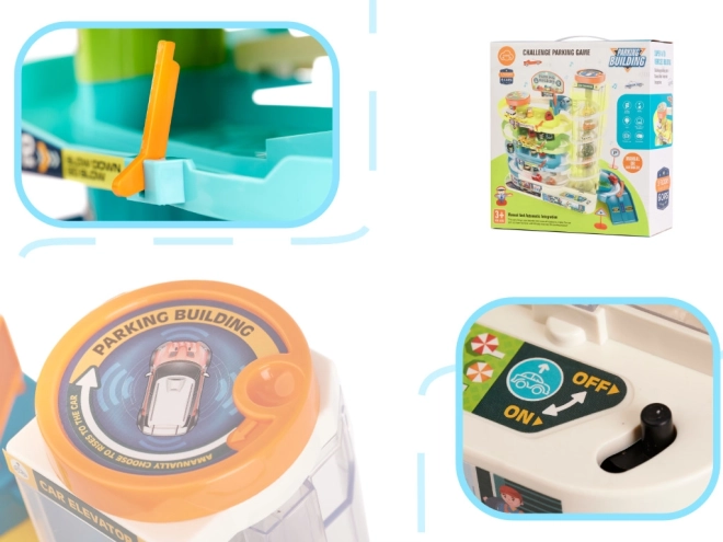Autíčka vyvezete na střechu stiskem tlačítka – výtah doprovází světla a veselá melodie. Při výpadku lze ovládat ručně, takže hra nikdy nekončí.