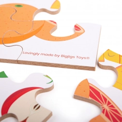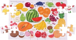 Puzzle obsahuje pestré ilustrace, které pomáhají dětem vizuálně identifikovat různé druhy ovoce jako je meloun, pomeranč nebo banány.