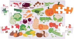 Puzzle zahrnuje různé druhy zeleniny, jako jsou dýně, papriky, a mrkve, učí děti o výživě a zdravém životním stylu.