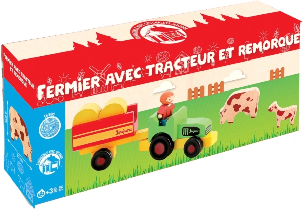 Dřevěná postavička farmáře s traktorem, přívěsem a zvířátky od značky Jeujura. Ideální doplněk k dřevěným stavebnicím. Kombinujte a tvořte nové příběhy.