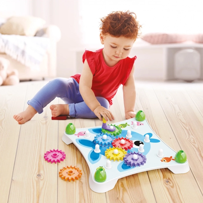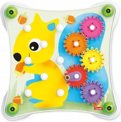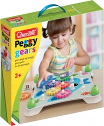 Quercetti Peggy Gears je chytrá a zábavná stavebnice s převody, která nadchne malé objevitele od 2 let. Děti si mohou skládat barevná ozubená kola na stabilní základnu, zarovnávat je podle ilustrovaných karet a pomocí kliky uvést všechna kola do pohybu. Jediným otočením spustí fascinující řetězovou reakci, která podporuje pochopení příčiny a následku.
