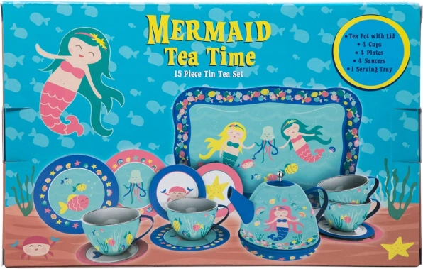 Když je čas na čaj, není lepší volby než tato nádherná kovová čajová souprava. Kreativita stoupá, když vaše děti hostí kamarády, panenky a plyšové hračky s touto krásnou čajovou sadou. Sada obsahuje 4 šálky s podšálky, 4 dezertní talířky, konvici na čaj s pokličkou a servírovací tác, vše v designu mořských pannen.