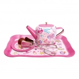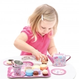 Čas na kouzelný čajový dýchánek! Tento bohatý čajový set pro děti nabízí vše pro zábavné stolování s rodiči, panenkami i plyšáky. Sada je detailně dekorovaná, vyrobená z odolného lehkého kovu a nezávadného plastu, podporuje fantazii, spolupráci a komunikační dovednosti. Obsahuje servis pro 4 osoby a celkem 35 dílů, včetně patrového stojanu na sladkosti.