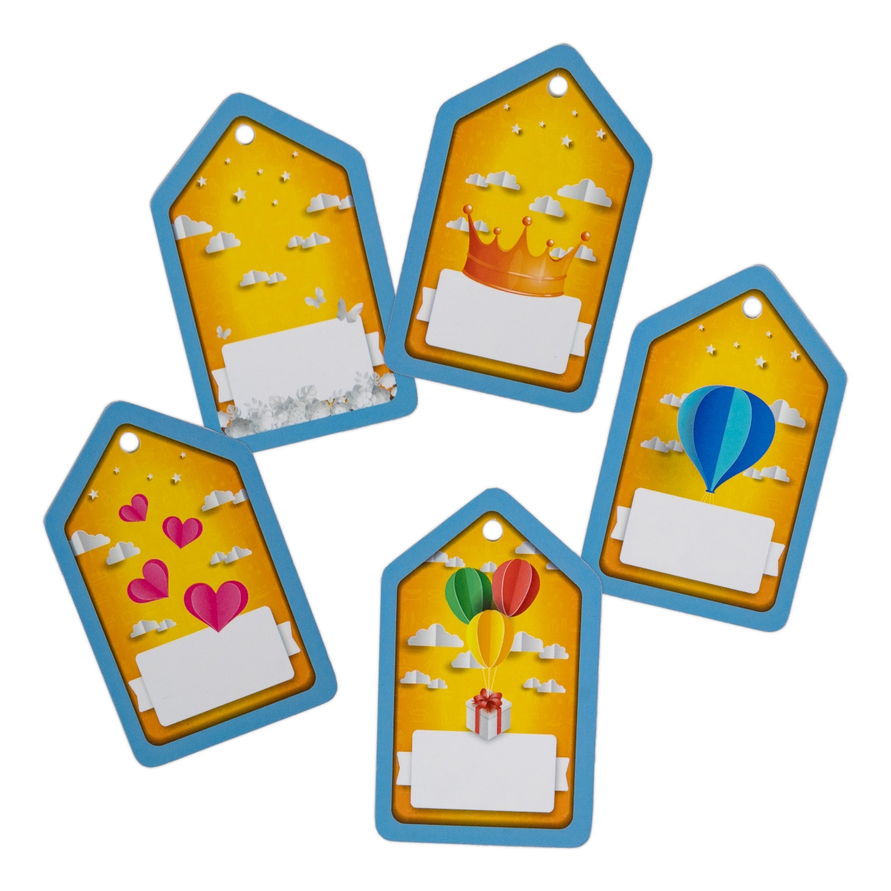 Tři archy samolepek a pět popisovatelných visaček dodají dárku osobitý nádech – od gratulací až po romantické vzkazy.