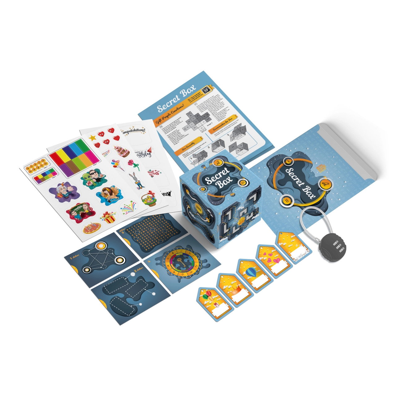 V balení najdete vše potřebné: krabičku, zámek, 4 karty nápovědy, 3 archy dekoračních samolepek a 5 popisovatelných visaček pro personalizaci. Vnitřní přihrádka o rozměrech 11,5 × 11,5 × 10,5 cm pojme drobný dárek, voucher či osobní vzkaz. Produkt je vyroben v EU a doplněn obrázkovým návodem v angličtině a němčině.