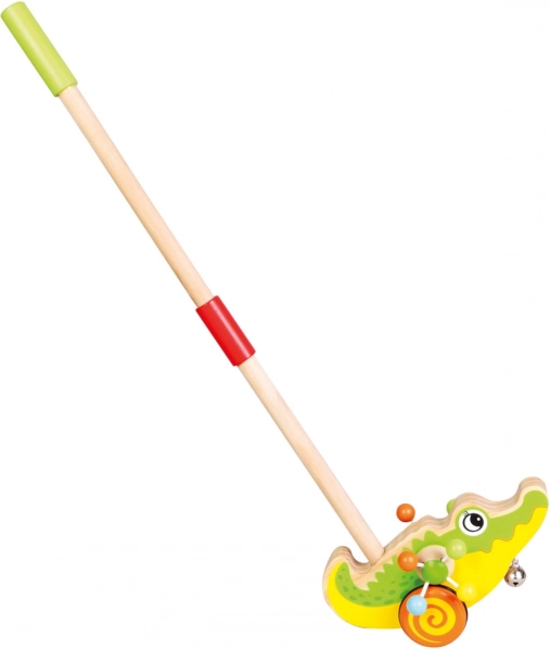 Oblíbený dřevěný jezdík ve tvaru krokodýla na tyči s rolničkou, který při jízdě vydává zvuky. Skvělá hračka pro první krůčky – podporuje motoriku, učení barev a zvířat a nabízí tichý chod díky pogumovaným kolečkům.