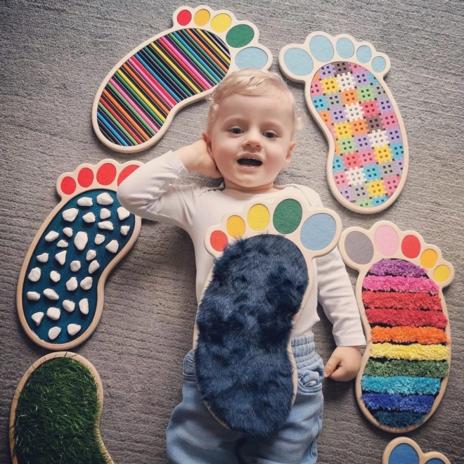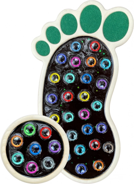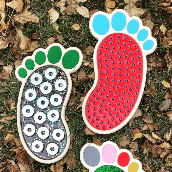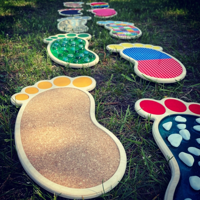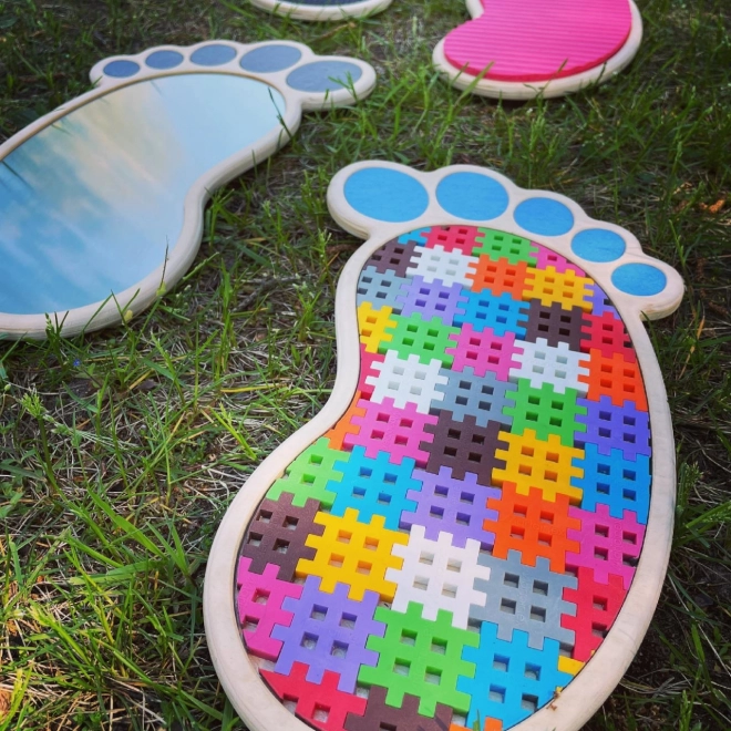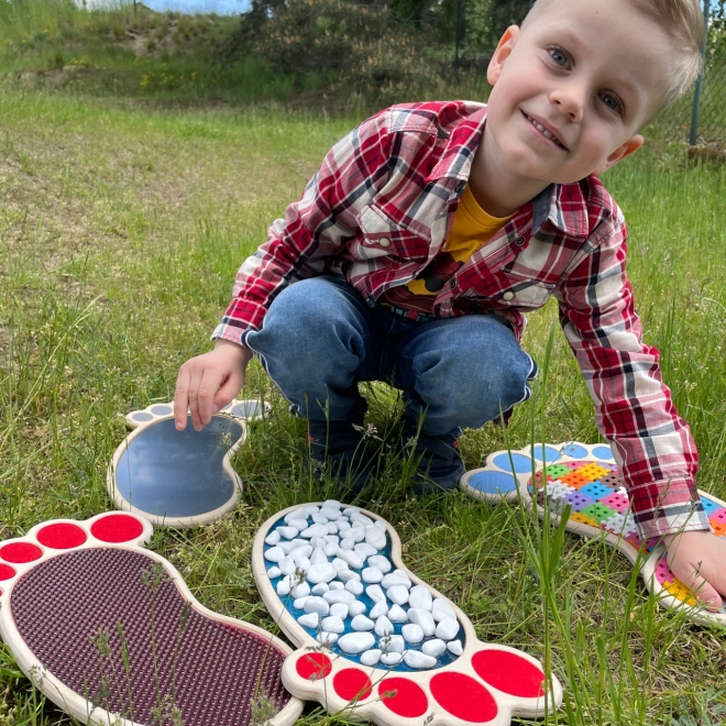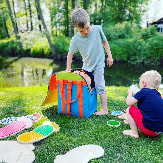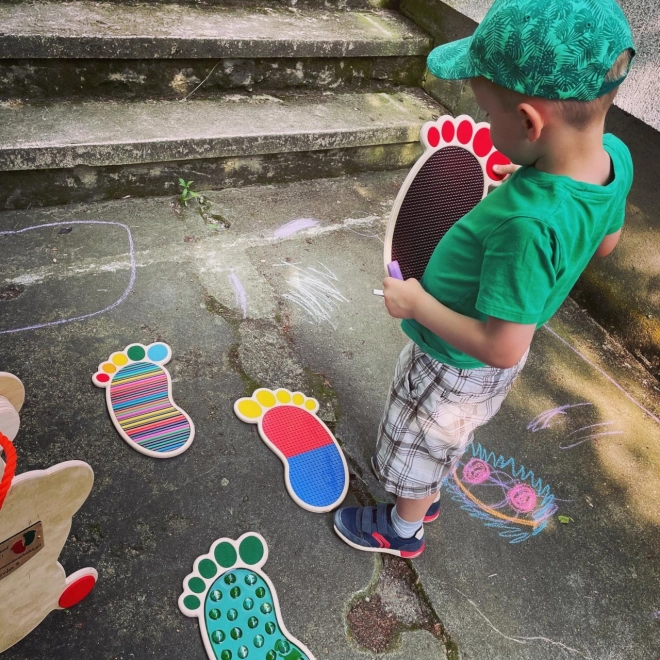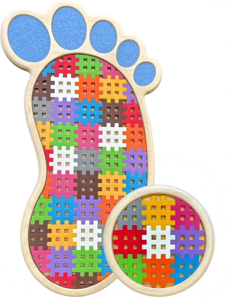 Souprava senzorických stop a kruhů je navržena tak, aby byla robustní a odolná, ideální pro každodenní použití. Barevné a kreativní designy přidávají estetiku vašemu prostoru a mohou být využity také pro různé činnosti. Stylové a pevné dřevěné organizéry umožňují snadné uskladnění soupravy.