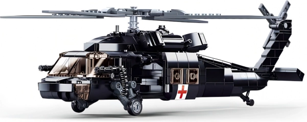 Model věrně zachycuje siluetu Black Hawku v medevac konfiguraci s červeným křížem. Otáčivé rotory a stabilní podvozkové lyžiny přidávají na autentičnosti i hratelnosti.