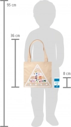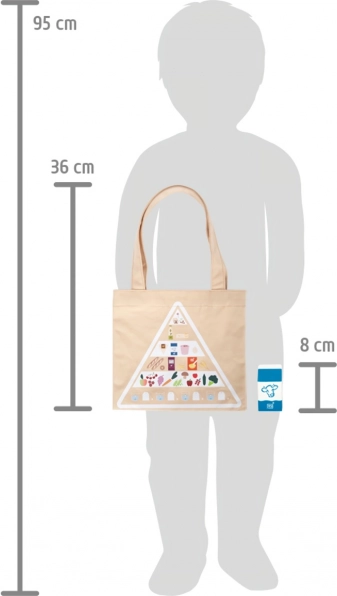 Díky bavlněné tašce s potiskem potravinové pyramidy se děti hravě učí o správném stravování, ekologii a odpovědných nákupech. Odolné zpracování ze dřeva a textilu je příjemné do ruky a ideální do dětských kuchyněk a prodejních stánků. Sada je kompatibilní s dalšími produkty řady „Fresh“.