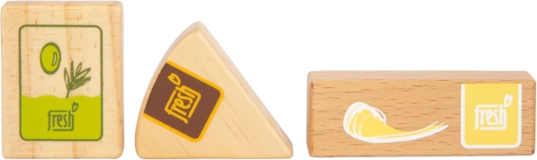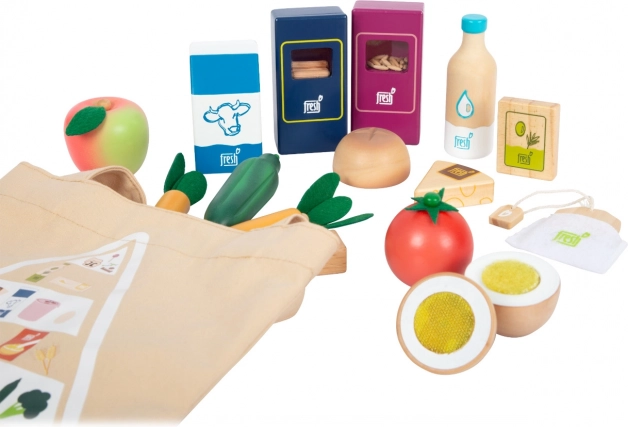 Sada vegetariánských potravin Fresh přináší dětem vše, co potřebují pro kreativní kuchařské a obchodní hry. Dřevěné kousky jako mléko, máslo, sýr, olej, vejce, rýže, těstoviny, pečivo, jablko, rajče, okurka a mrkev doplňuje láhev vody a čajový sáček. Realistické detaily, včetně průzoru u balení rýže a těstovin (při zatřesení vydávají zvuk), zvyšují atraktivitu i autenticitu hry.
