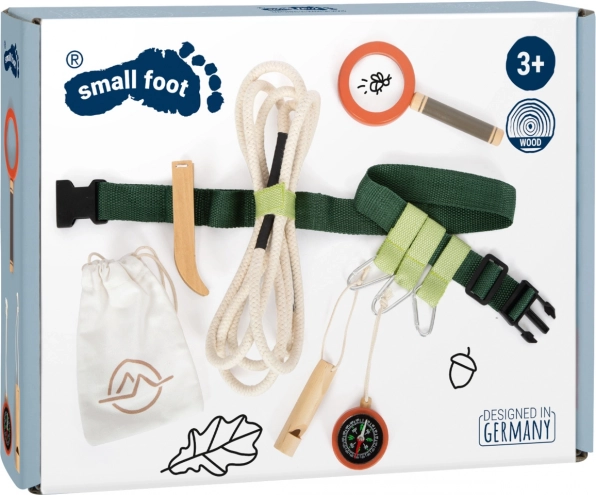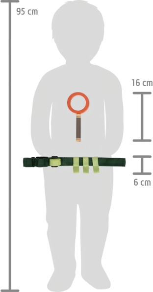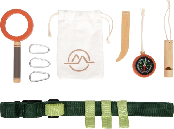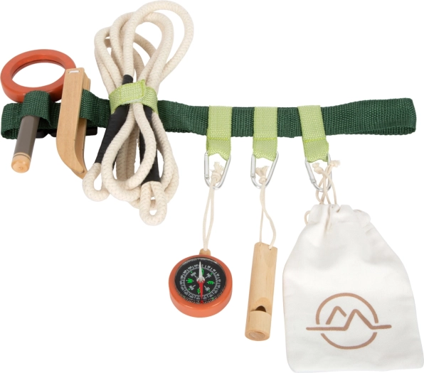 Vydejte se na nezapomenutelná dobrodružství s opaskem plným vybavení. Děti budou nadšeny odolným pásem, který zahrnuje dřevěnou píšťalku, lupu, pinzetu, kompas, lano a textilní pytlík. Vše je snadno připevnitelné pomocí oček a karabin.