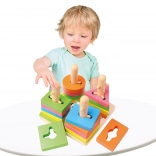 Objevte chytře navrženou dřevěnou hračku pro děti od 3 let, která spojuje učení tvarů a barev, rozvoj jemné motoriky a koordinace oko–ruka. Dítě navléká barevné dílky na sloupky s výřezy a při zábavě si přirozeně trénuje logiku i představivost.