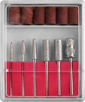 V balení najdete diamantové frézy i brusné válce pro tvarování, čištění kůžičky a finální leštění.
