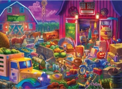 Barevná scéna plná detailů – stodola s nápisem For Sale, hospodářská zvířata, starý náklaďák s úrodou i sezónní dekorace. Ideální pro milovníky venkovských motivů a propracovaných ilustrací.