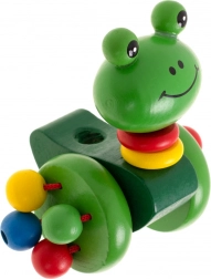 Žabka má dvě velká kolečka s barevnými korálky, které při pohybu chrastí, čímž činí hru ještě zábavnější. Hračka je pečlivě vypracovaná, s hladkými hranami, které eliminují riziko zranění třískou.