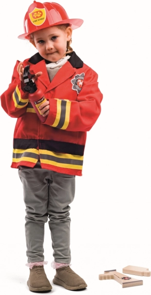 Dětský hasičský kostým BIGJIGS TOYS nabízí vše, co malí hasiči potřebují pro napínavou záchrannou misi. Jasně červená bunda s pruhovanými rukávy a emblémem, nastavitelná helma (49–55 cm) a doplňky jako dřevěný hasicí přístroj, vysílačka a megafon dávají hře realistický rozměr.