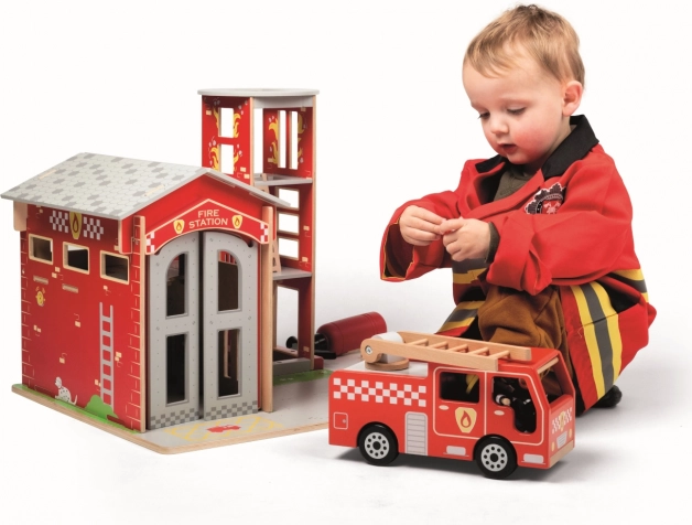 Součástí balení je dřevěný hasicí přístroj, vysílačka a megafon – vše pro autentické hasičské mise a nekonečné příběhy.