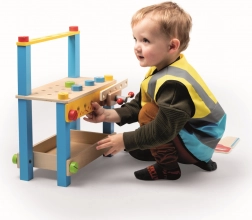 Součástí sady jsou dřevěné i plastové nástroje – pila, šroubovák, hasák, kladivo, ochranné brýle a průkaz. Děti tak mohou napodobovat práci stavitelů a rozvíjet jemnou motoriku.