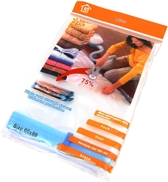 Praktický vakuový úložný sáček o rozměru 60 × 80 cm šetří místo až o desítky procent a spolehlivě chrání oděvy, ložní prádlo či textilie před prachom, vlhkostí, plísněmi a nežádoucími pachy. Díky ventilu pro vysavač a posuvnému jezdcíku se snadno používá, je znovu použitelný a ideální na cestování i sezónní skladování.