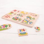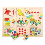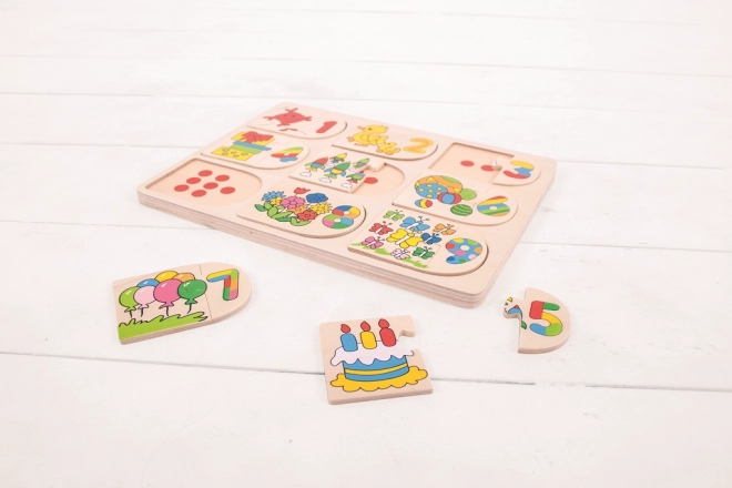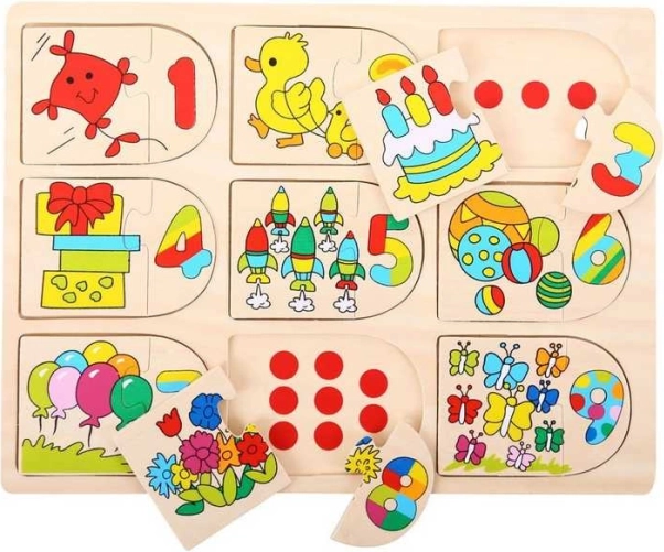 Tato barevná dřevěná skládačka s čísly a obrázky pomáhá dětem přirozeně chápat vztah mezi množstvím a číslicí. Dílky jsou navrženy tak, aby je malé ruce snadno zvedly a vložily na správné místo, což podporuje samostatnost a soustředění.