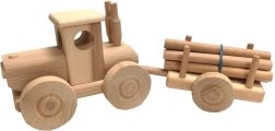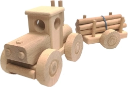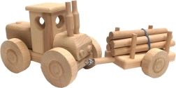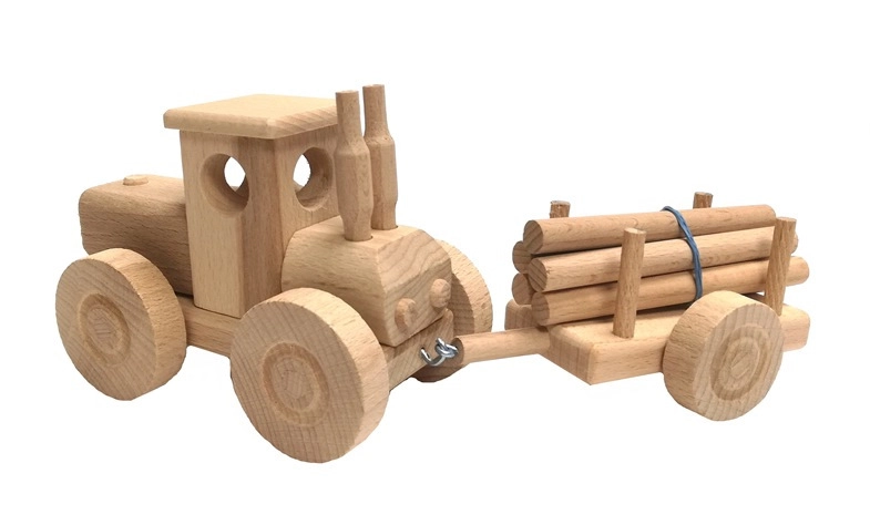 Díky zaobleným hranám a pečlivému leštění je hračka příjemná na dotek a bezpečná pro děti od 3 let. Rotující kolečka a funkční zapojení přívěsu podporují rozvoj jemné motoriky, fantazii i rolové hry na farmáře a lesní techniku.