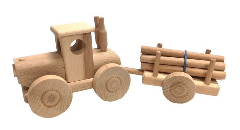 Traktor i přívěs jsou vyrobeny z kvalitního bukového dřeva s voskovaným, leštěným povrchem – krásný vzhled, příjemný dotek a dlouhá životnost.
