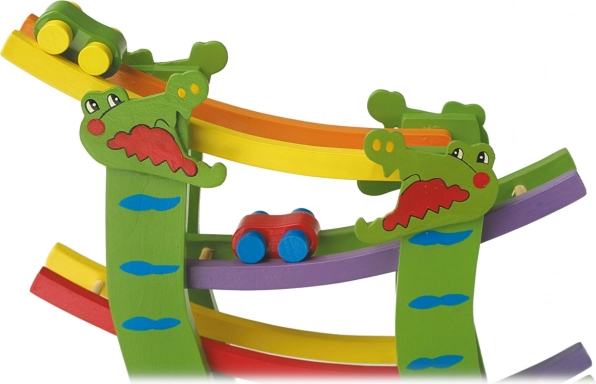Tato dřevěná závodní dráha s krokodýly promění dětský pokoj v malý závodní okruh. Děti umístí autíčko na start a sledují, jak po jednotlivých patrech svižně klouže až do cíle. Pestré barvy a veselý motiv krokodýlů lákají ke hře znovu a znovu.