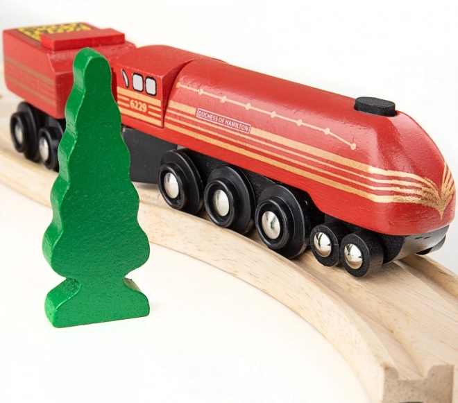 Detailně zpracovaná lokomotiva „Duchess of Hamilton“ s kovovými koly nadchne všechny milovníky historických vlaků a ozdobí každou dřevěnou trať.