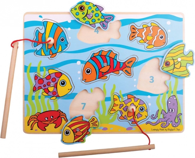 - Kompletní set: dřevěná deska, magnetická udice a rybky – celkem 10 dílů
