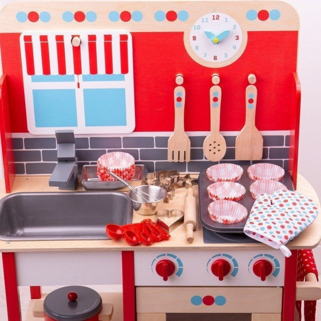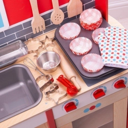 Tato komplexní sada na pečení obsahuje veškeré vybavení, které každý malý kuchař potřebuje pro své první pečení. Včetně plechu na pečení, chňapky, formy na bochník, šlehací metly, dřevěného válečku, misky, sady odměrných lžic a šesti vykrajovátek na pečivo.