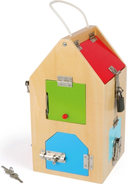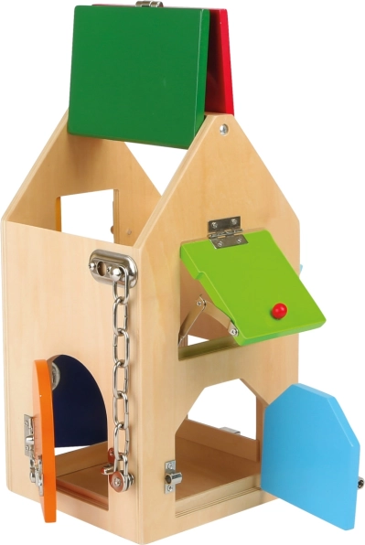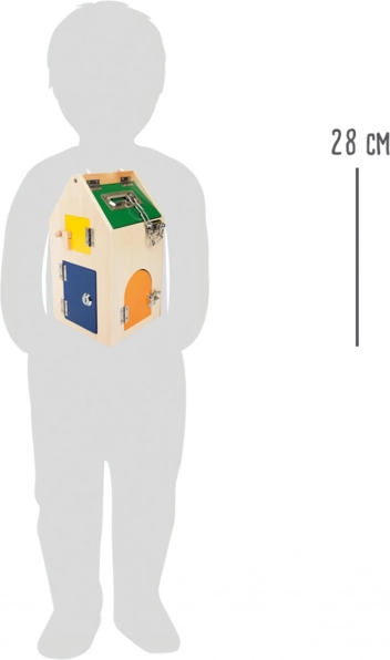 Domeček je vyroben z kvalitního dřeva v kombinaci s pevnými kovovými částmi, takže vydrží i intenzivní používání. Díky kompaktním rozměrům a praktickému držadlu je snadno přenosný – ideální na cesty, do školky i dětského pokoje. Barevné prvky lákají k objevování a podporují rozpoznávání barev.