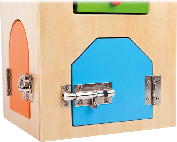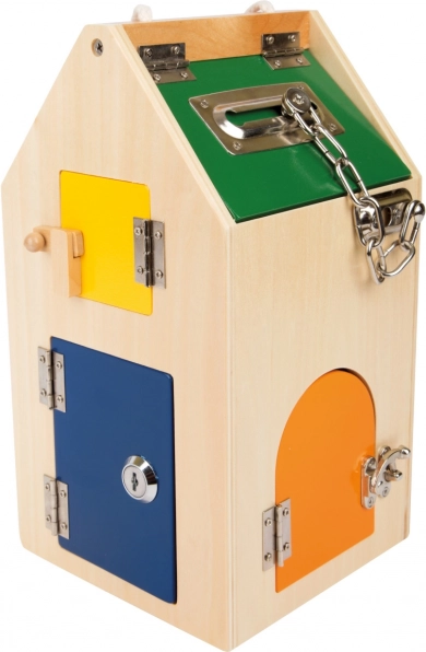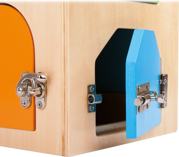 Motorický domeček se zámky small foot je chytrá didaktická hračka, která dětem ve věku od 3 let umožní bezpečně zkoumat svět uzávěrů a mechanických prvků. Každé dvířko ukrývá jinou výzvu – od U zámku a cylindrického zámku, přes různé šrouby a páčky, až po panty a bezpečnostní řetěz. Tím přirozeně rozvíjí koordinaci oko–ruka, trpělivost a soustředění.
