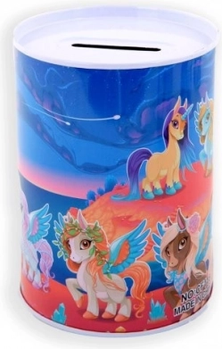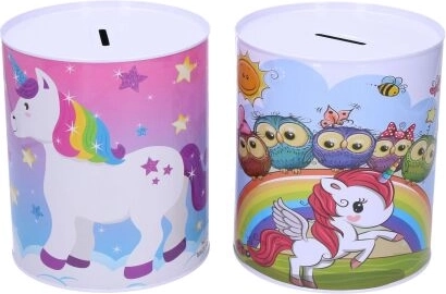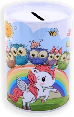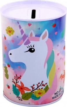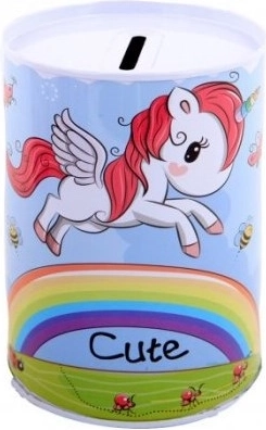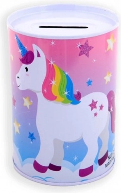 Kovová pokladnička s motivem jednorožce je nejen praktickým pomocníkem pro spoření, ale také krásným dekorativním prvkem dětského pokoje. Její barevné ilustrace jednorožců, duhy a hvězd potěší každé dítě.