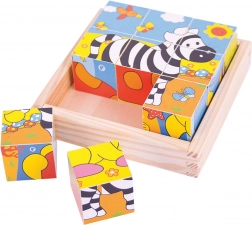 Devět dřevěných kostek vytváří šest různých obrázků. Otočte každou kostkou a vytvořte obrázek, nebo je smíchejte pro zábavu! Každý kus je vyroben tak, aby usnadnil zvedání, uchopení a zkoumání v malých rukou.