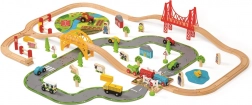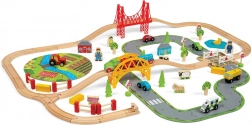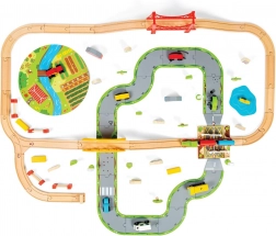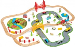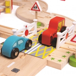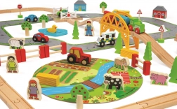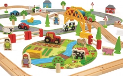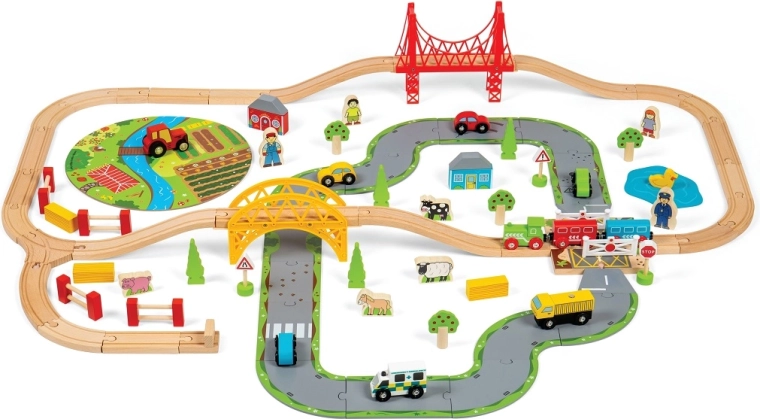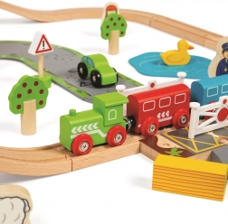 Tato dřevěná vláčkodráha s venkovskou cestou je perfektním propojením vláčkodráhy a autodráhy, které napodobují skutečný dopravní svět. Díky mostům a přejezdům se vaše děti dostanou do světa plného zábavných dobrodružství. Vše je doplněno místními doplňky jako je farma, budovy a stromy, které zkrášlují okolí.
