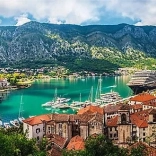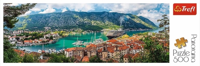 Puzzle zobrazuje malebnou scenérii přístavního městečka Kotor s jeho ikonickými červenými střechami a zelenými horami.