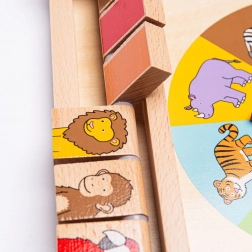 Barevná ruleta a jasné ilustrace zvířátek podporují rozpoznávání a pojmenovávání. Děti si přirozeně procvičí slovní zásobu i vizuální vnímání.