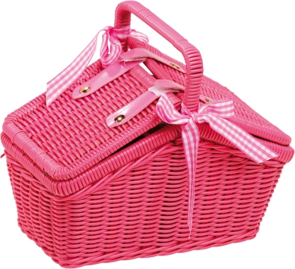 Tento růžový piknikový koš je ideálním společníkem na výlety s panenkami i na dětské čajové dýchánky. Moderní design ve stylu 70. let v kombinaci s kovovým nádobím s květinovým vzorem potěší malé hostitelky a hostitele. Koš z umělého proutí je dostatečně prostorný pro celou sadu nádobí i malé dobroty.