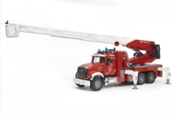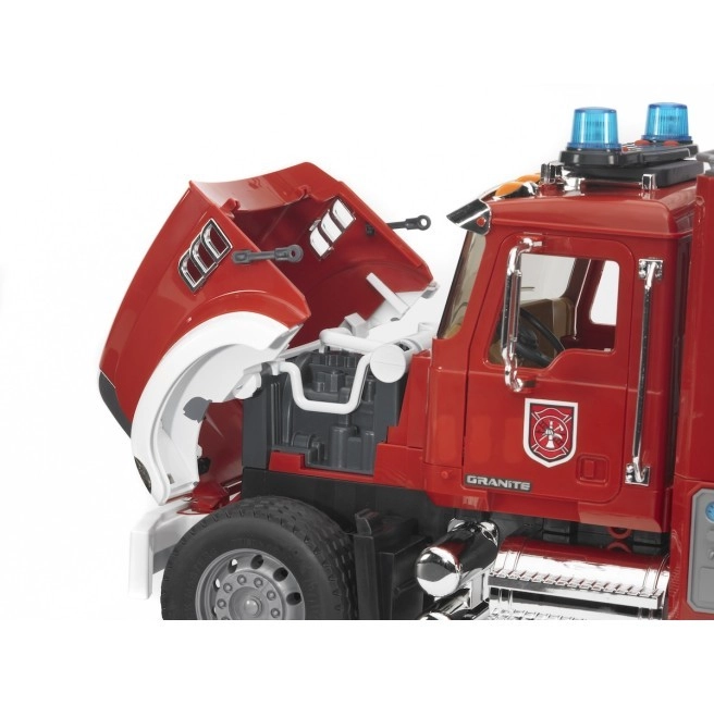 Realistický hasičský vůz BRUDER MACK Granite nadchne malé záchranáře funkční stříkačkou, výsuvným a otočným žebříkem až do 120 cm, stabilizačními podpěrami a světelným majákem se sirénou. Nabízí otevíratelné dveře, sklopná zrcátka, nahlédnutí pod kapotu a měkké profilované pneumatiky. Kompatibilní s figurkami Bworld, vyrobeno v Německu z kvalitních materiálů.