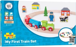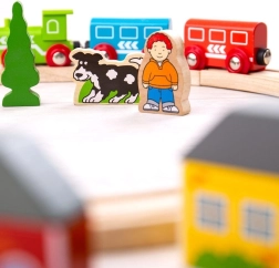 - 8× dřevěné koleje, 1× lokomotiva, 2× vagónek s magnetickými spojkami, 8× doplňky (domy, stromy, postavy)